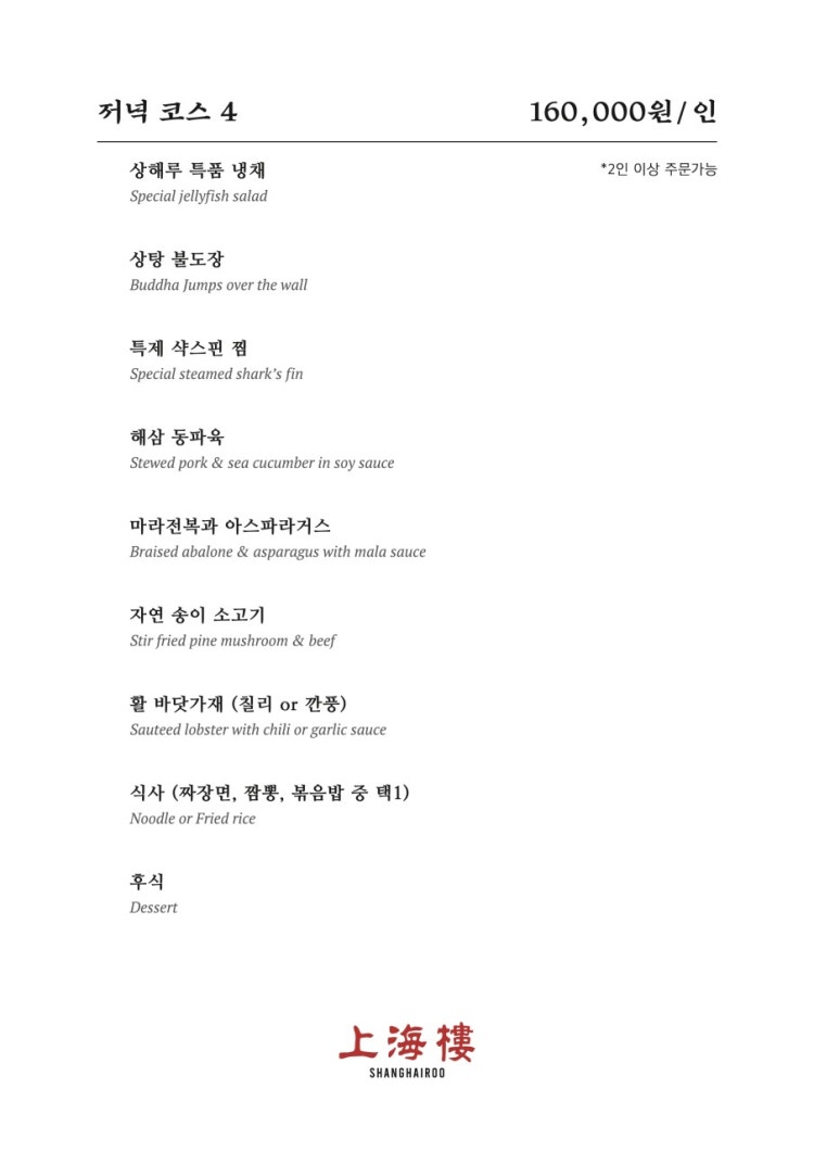 메뉴 – 미식가라면 놓칠 수 없는 상해루 코스 메뉴