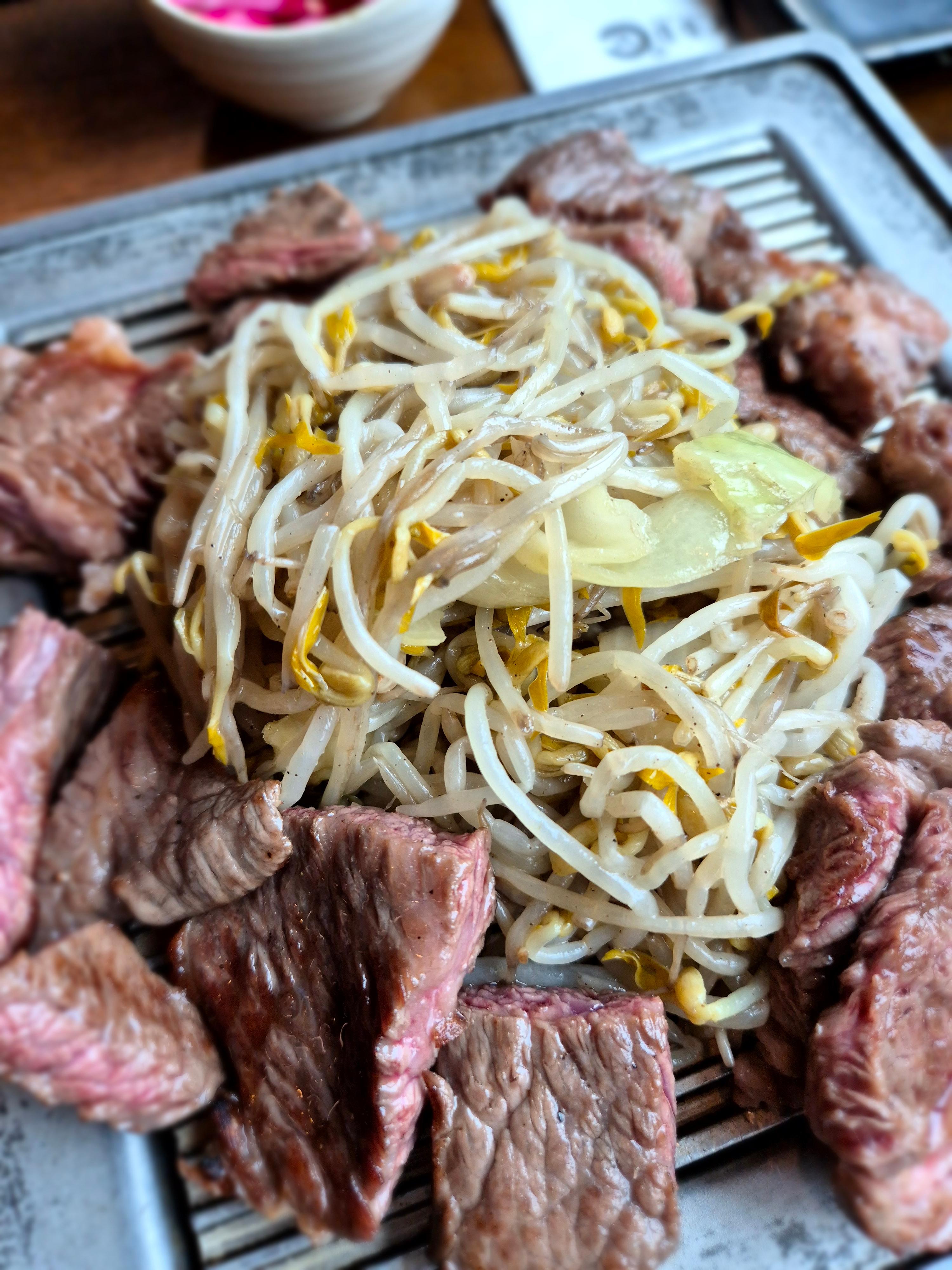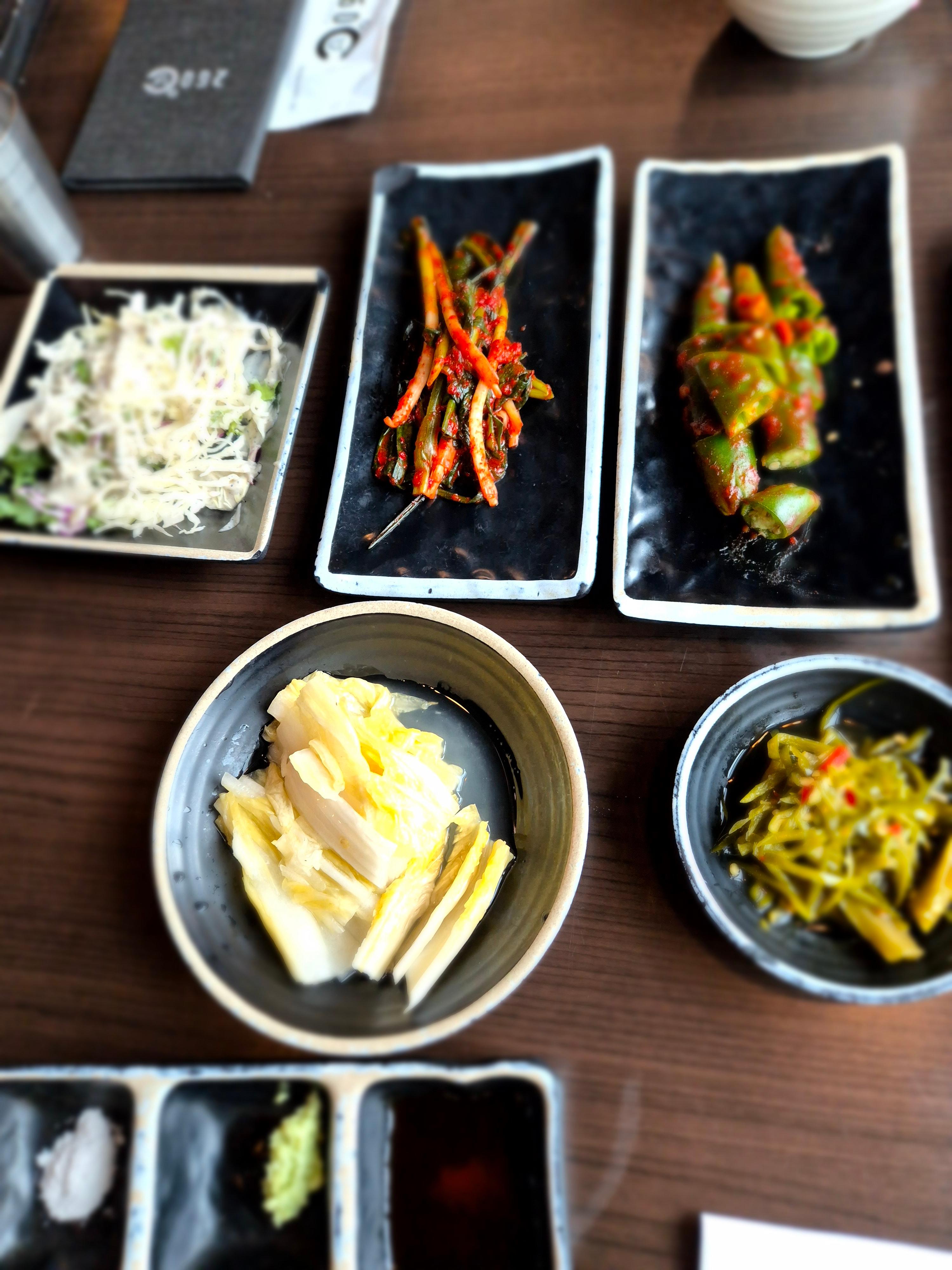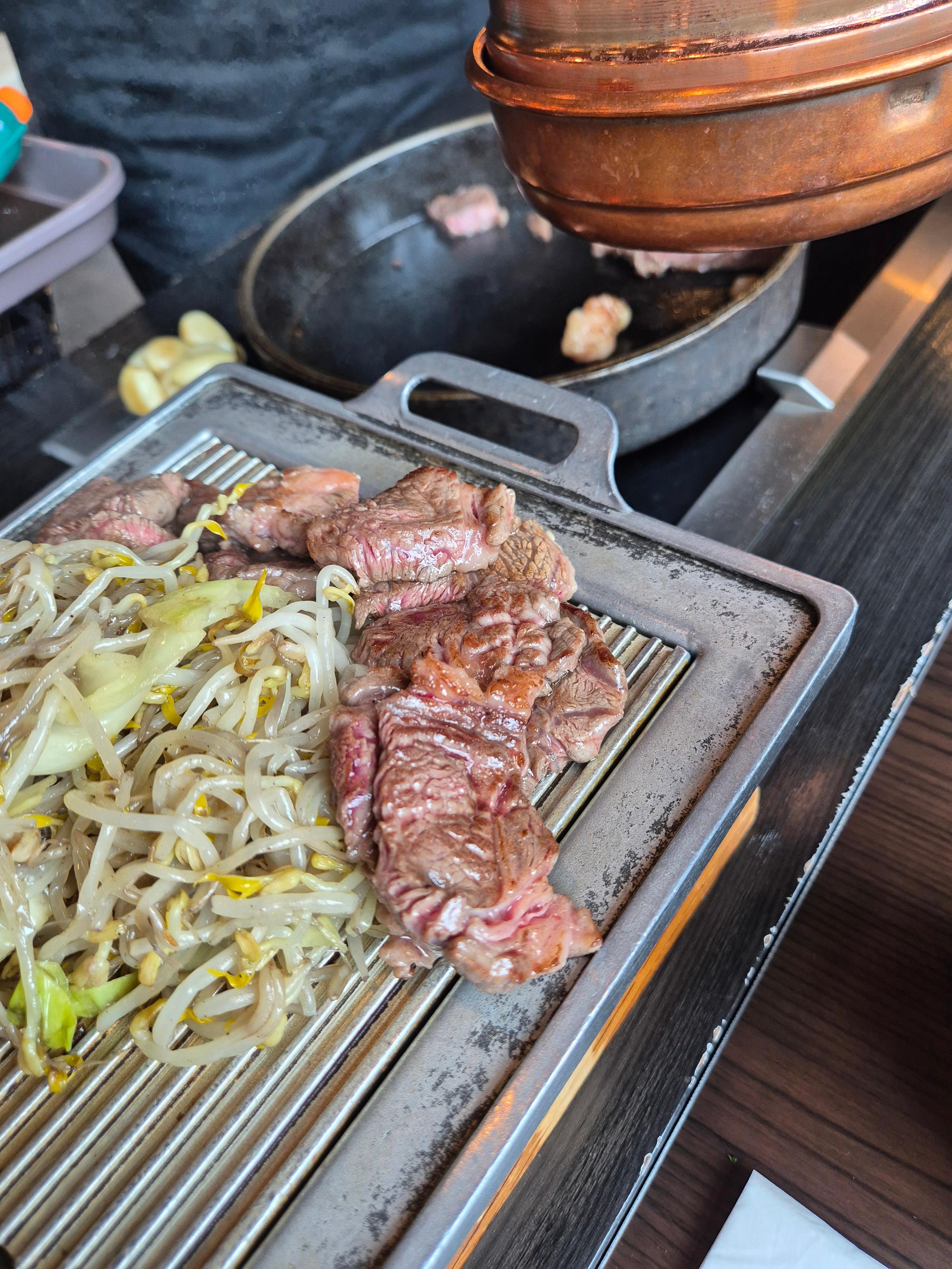 저는 주말 점심에 방문해서 런치세트 A 3인분과, 런치세트 B 3인분을 주문했습니다. 아래 실제 메뉴와 밑반찬이 어떻게 제공되는지 보시죠. 최고 장점은 테이블 옆에 마련된 공간에서 직원분이 직접 고기를 구워 테이블에 따뜻하게 내어주시기 때문에 가족 간의 대화가 전혀 방해받지 않고 누구 하나 고기 굽느라 신경 쓸 필요없이 모든 가족 구성원이 편하게 식사 할 수 있다는 점입니다.