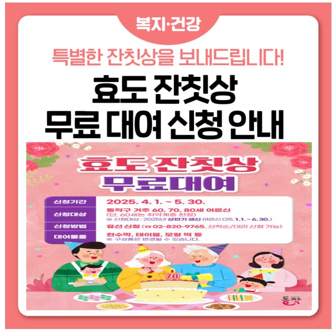 동작구에서 어르신들을 위한 특별한 효도 프로젝트를 진행합니다! 바로 '효도 잔칫상 무료 대여' 서비스인데요, 어르신들의 생신이나 기념일에 전통 잔칫상을 무료로 대여해드리는 프로그램입니다. 이 서비스를 통해 가족들과 함께 따뜻한 시간을 보내실 수 있습니다.